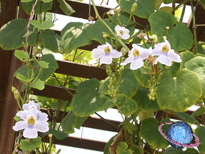 The Bengal Trumpet is a climber with orchid-like flowers and with the botanical name Thunbergia grandiflora.