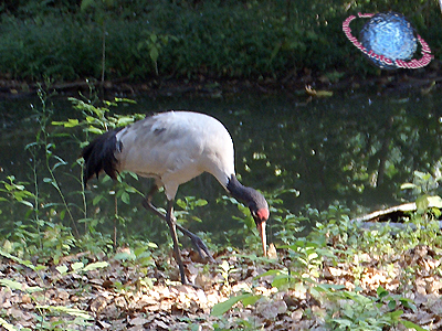 The Black-necked Crane is mostly grey, with a black tail, primaries and secondaries, a black naked head and neck, a dull red crown and lores, and a small patch of white feathers below and behind the eyes.