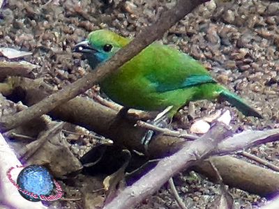 An adult female Blue-winged Leafbird, foraging at a river bank, near My Son (fig.), in central Vietnam.