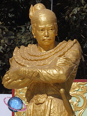 Statute of the Burmese King Bayinnaung in Tachileik (fig.). He is considered one of the three greatest kings of Burma, along with Anawrahta (fig.) and Alaungpaya (fig.).