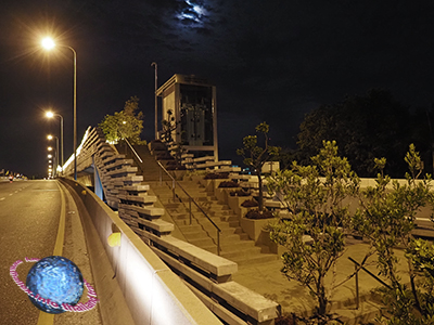 The Garden Bridge bridge 280 meters and is 8.5 meters wide, and features grasses, plants, shrubs, and small trees. It runs parallel to —and is wedged in between— the two viaducts that form the twin Phra Pok Klao Bridge, just south of the Memorial Bridge (fig.). It connects Phra Nakhon with Thonburi. At night, the sides of the green pedestrian bridge, which is officially known as Chao Phraya Sky Park, and in Thai as Suan Loi Fah Chao Phraya, are illuminated with a colourful display of lights. In the front here is the northern viaduct of the twin Phra Pokklao Bridge (fig.).