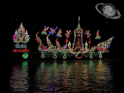 A colourfully lit vessel taking part in the Illuminated Boat Procession on the Mae Khong River in Nong Khai during the festivities on the occasion of the end of the rainy season in 2020.