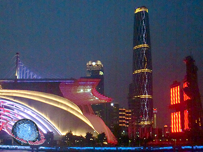 The 440 meter high, International Finance Center in Guangzhou, at night. It was completed in 2010 and houses a hotel and offices.