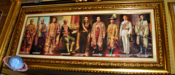 Portrait of the nine previous Kings of the Chakri Dynasty (fig.), starting with King Rama I, Phra Phutta Yotfa Chulalok, the founder of the dynasty, through to Rama IX, Bhumipon Adunyadet.