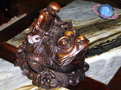 The informal Chinese god of wealth Liu Hai luring Chanchu, the Lucky Money Toad, with a line baited with gold coins.