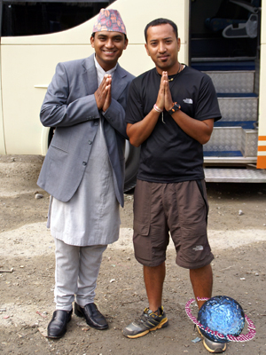Two Nepalese men, with the one on the left wearing Nepalese national dress, including a colourful, brimless hat or topi, known as a Dhaka topi (fig.).