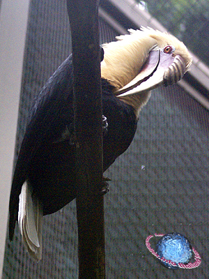 base and its casque has dark ridges. Its legs and feet are grey, and its eyes are