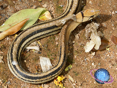black stripes on the anterior part. The head is yellowish to coppery brown with