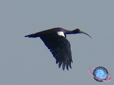 A Red-naped Ibis (fig.) in flight over Chitwan, the white shoulder patch clearly visible, as is the crimson nape on the naked black head.