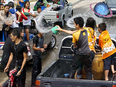 Songkraan festival is celebrated by the enthusiastic drenching of each other with water and to smear each others face with wet talcum powder (fig.).