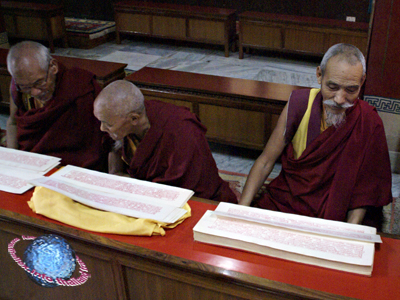 Tibetan Buddhist monks and novices at a temple near the Bodnath Stupa in Kathmandu (fig.), chanting (fig.) from their Buddhist canon.