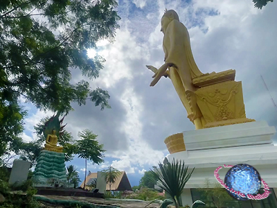 Phra Phuttha Chayanti Nong Bua Lamphu is a golden Buddha statue that stands in the pahng prathan phon or ‘blessing pose’ at the summit of Wat Doi Thep Somboon and overlooks the city of Nong Bua Lamphu.
