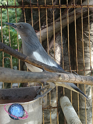A male White-shouldered Starling in southern Vietnam. It has a mostly grey plumage, with black wing feathers, a black tail with a white border, and a white shoulder patch.