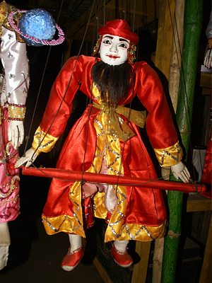 A string-puppet of Zaigi or Zo-gji, the alchemist from Burmese folklore, as used in yokthei pwe. He typically carries a red stick, wears a red brimless hat with earflaps, and a long red jacket trimmed with gold (fig.).