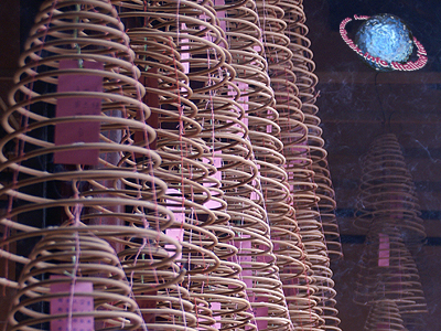 Incense coils are coils or spirals of incense, and are typically found hanging from rafters in Chinese-style temples, as this one in Kuala Lumpur.