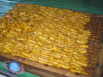 It is a kind of snack made of whole yet thin bananas, that are locally known as lady fingernail bananas (fig.).
