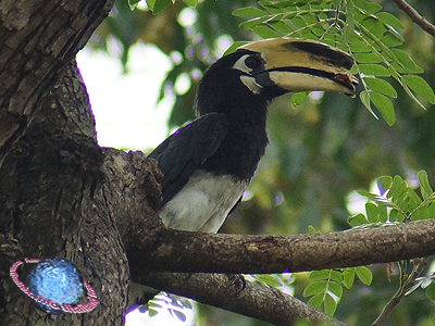 A male Oriental Pied Hornbill spotted perching high up in a tree in downtown Saigon.