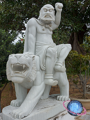 Marble statue of Phuc Ho La Han, i.e. Pindola (fig.), one of the Eighteen Arahats (fig.), who is nicknamed the Taming Tiger Luohan or the Tiger Taming Arahat, at Chua Linh Ung (fig.), a Buddhist pagoda in Da Nang.